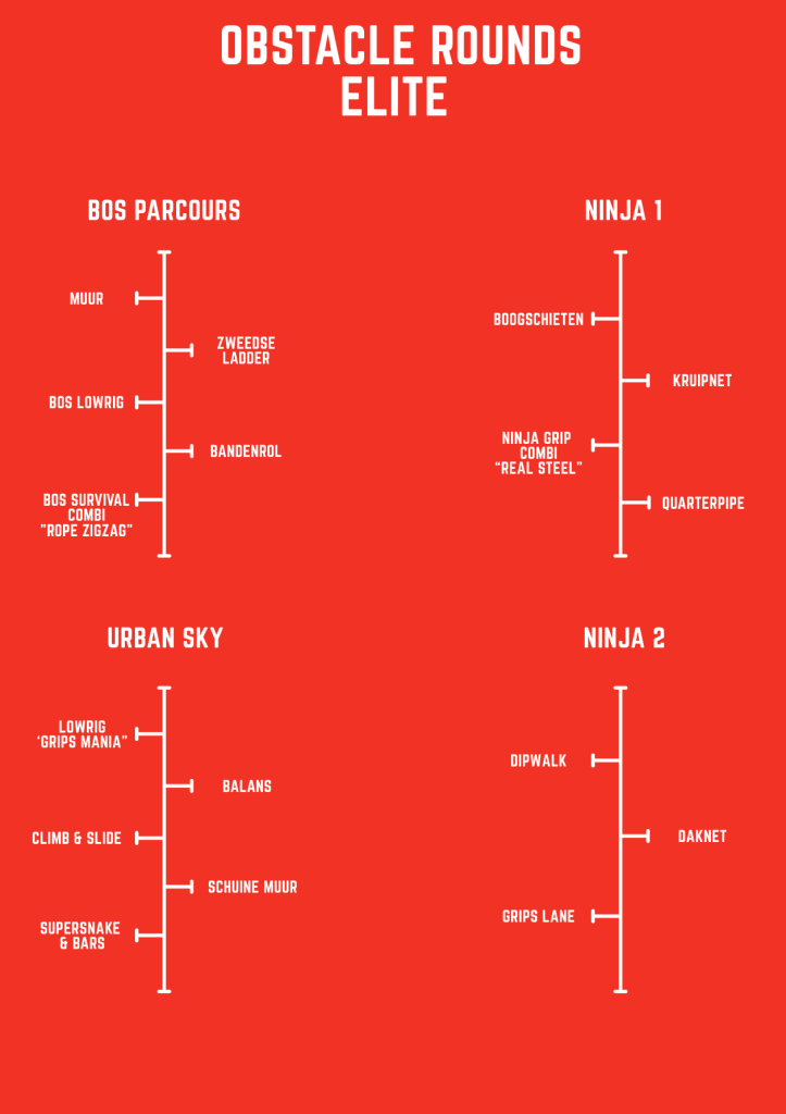 Elite: Survivalcombinatie, Ninja Warrior, Swingover, Urban Sky, boogschieten.