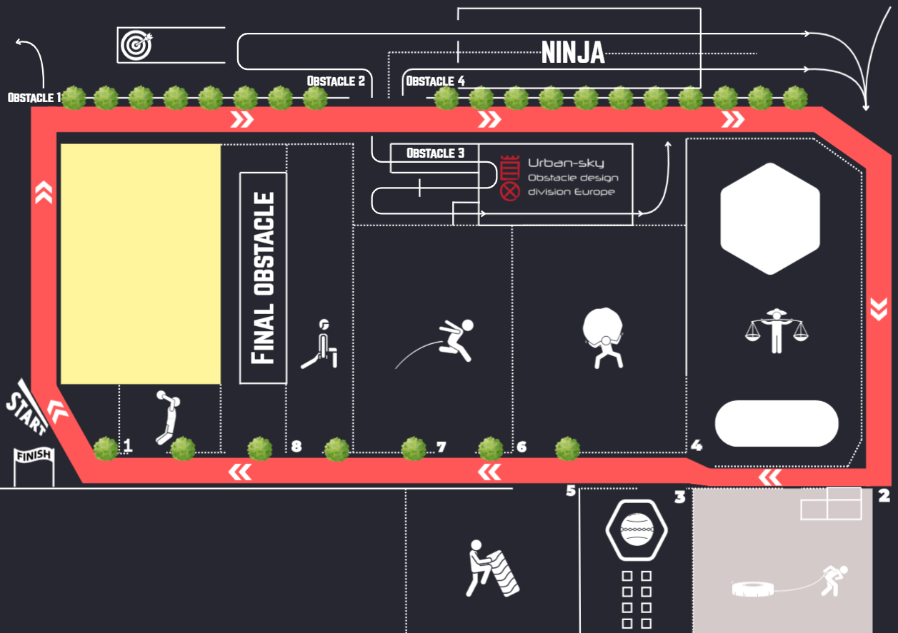 Ook tijdens de obstacle round volg je de rode lijn totdat je bij het desbetreffende onderdeel aankomt.